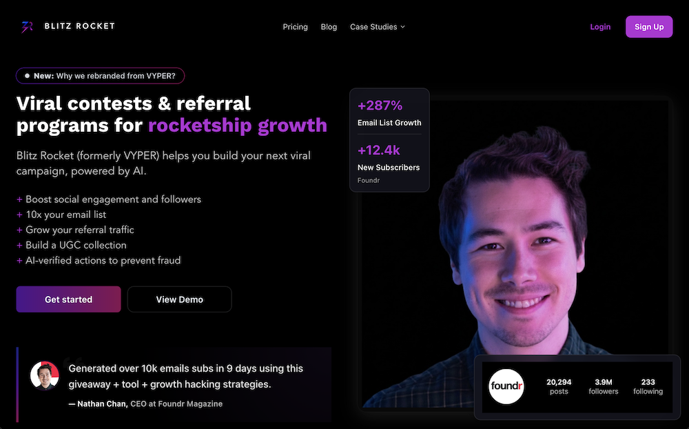 Blitz Rocket (Formally Vyper.io) is a digital marketing tool that focuses on creating viral contests and reward programs. It helps businesses generate more leads, referrals, and growth by creating engaging campaigns that encourage users to share and engage with their content.