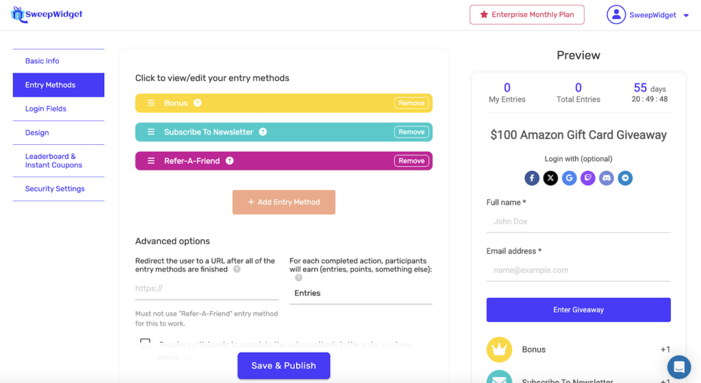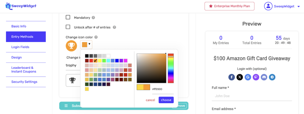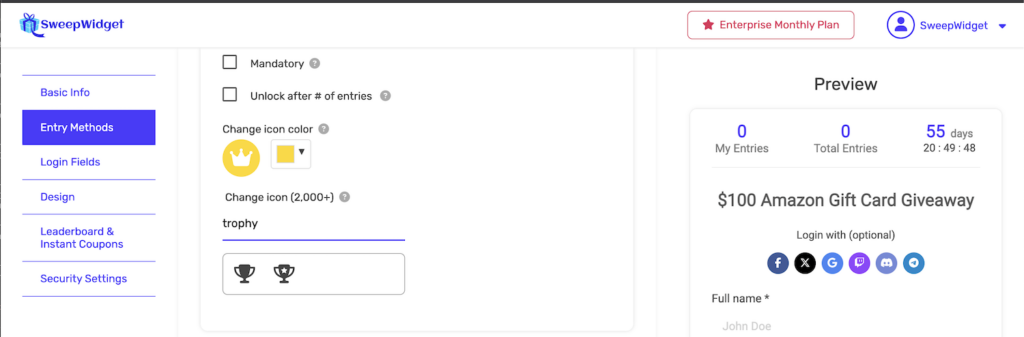 SweepWidget allows you to customize the icon displayed next to each entry method. You can choose from over 2,000 icons and set a custom color to match your brand.