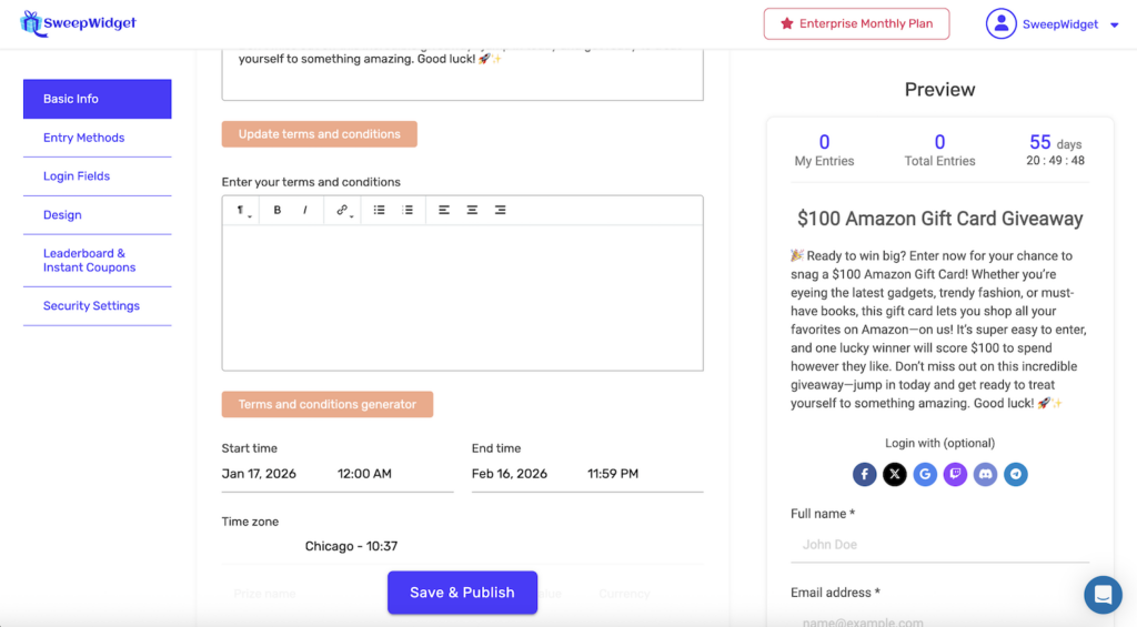 SweepWidget provides an official rules template that automatically generates comprehensive sweepstakes rules based on your giveaway details.