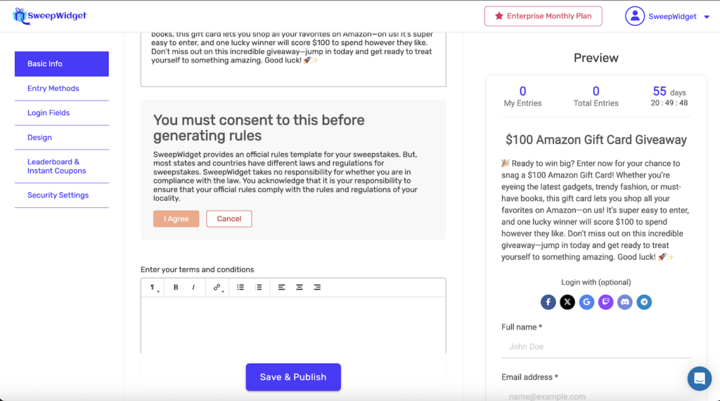 Adding official rules to your giveaway is important for legal compliance and setting clear expectations for participants. SweepWidget allows you to manually write your own rules or use the built-in rules generator to create comprehensive official rules automatically.