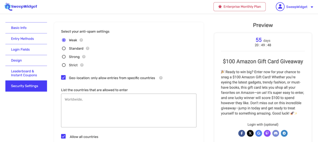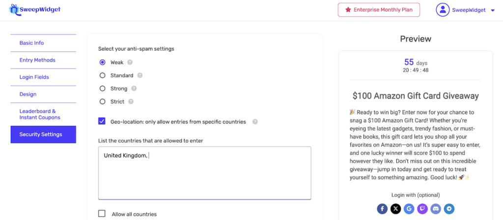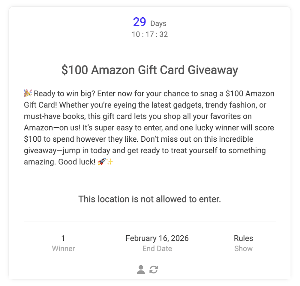Geo-targeting allows you to restrict your giveaway entries to participants from specific countries. This is essential for legal compliance, shipping limitations, or when running region-specific promotions.