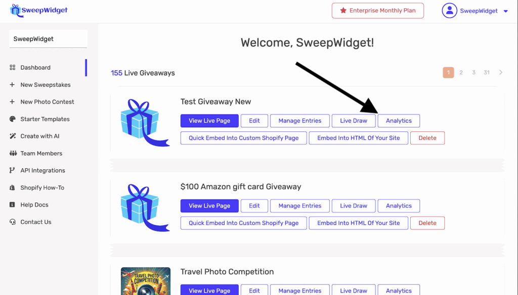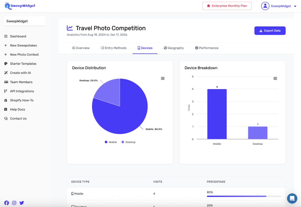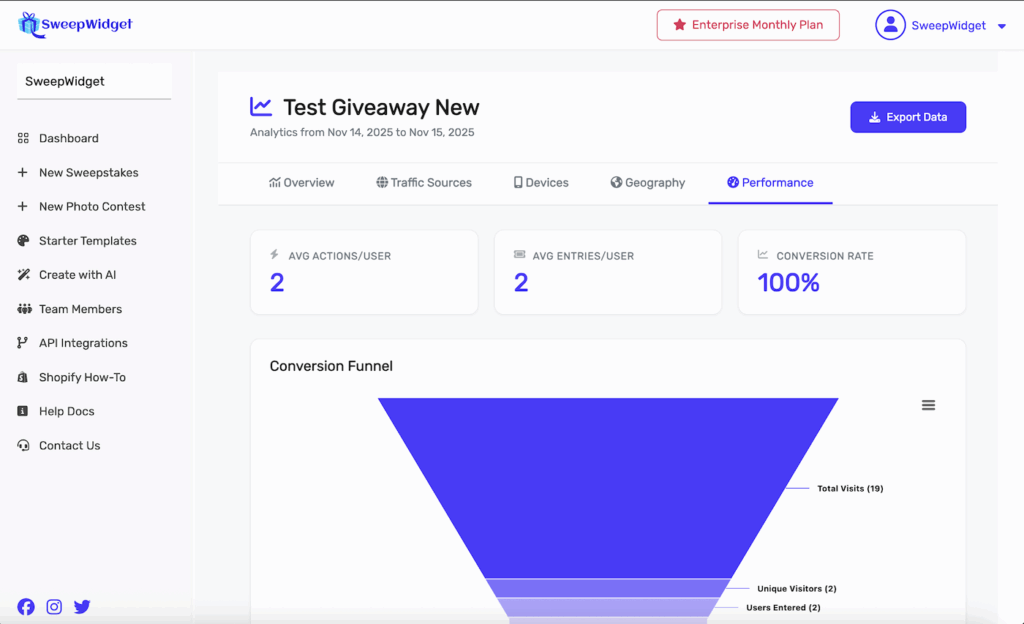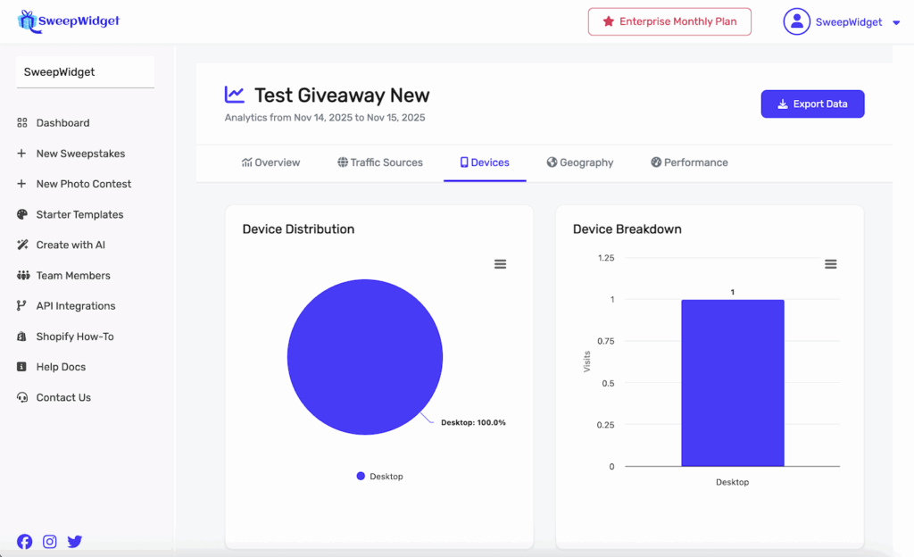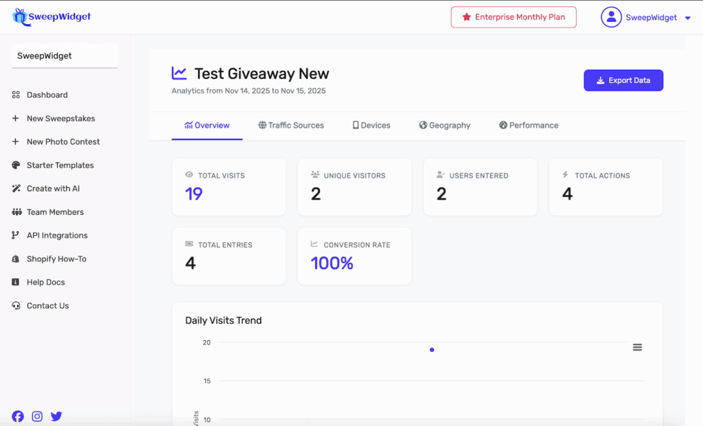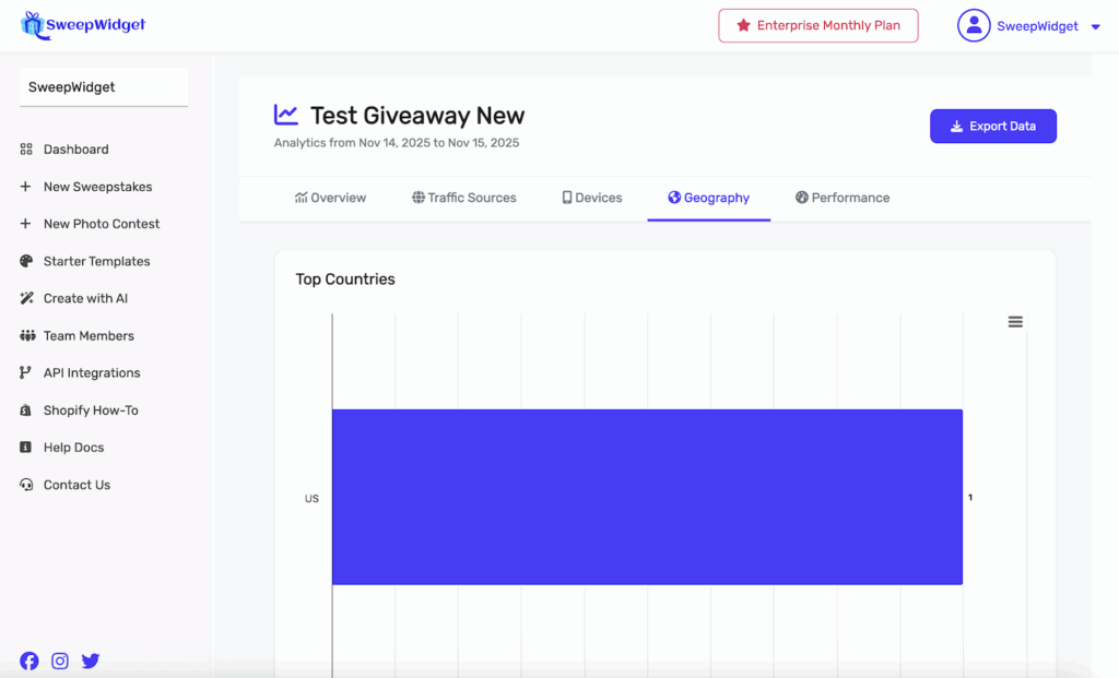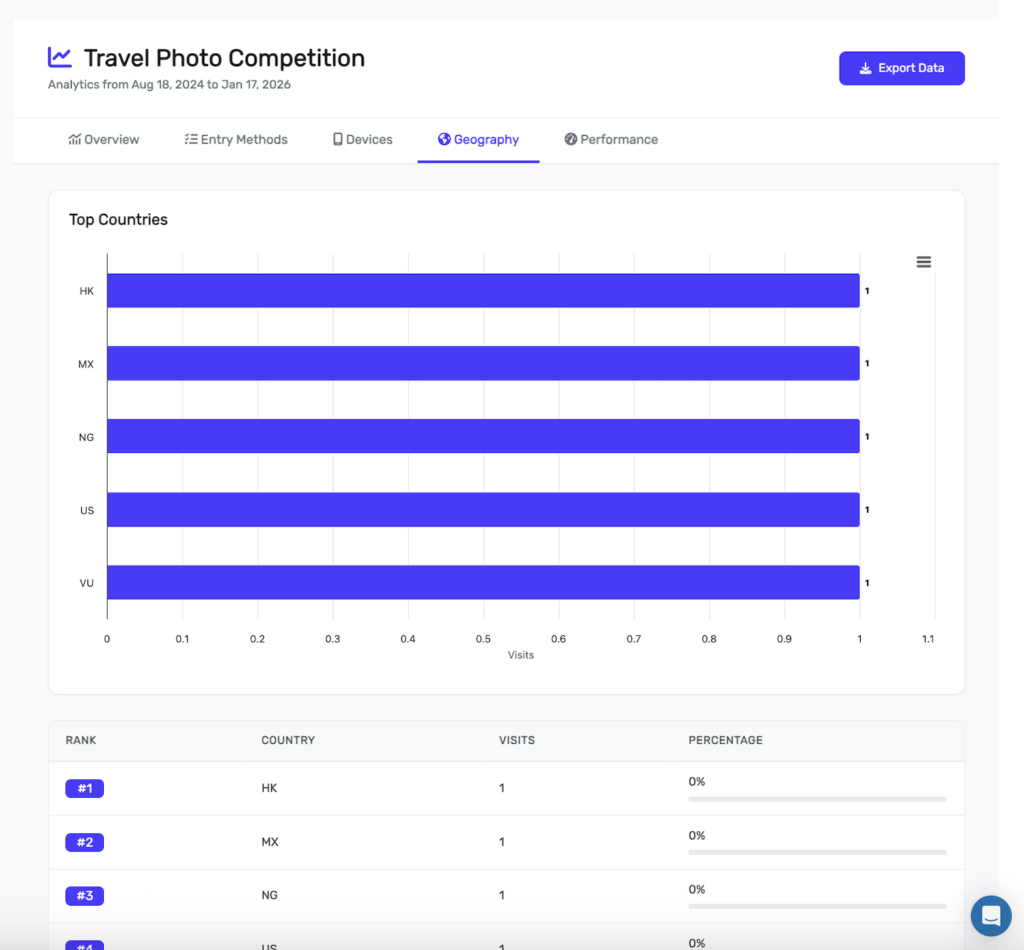 Analytics are available on all plans and automatically track data from the moment your giveaway goes live.