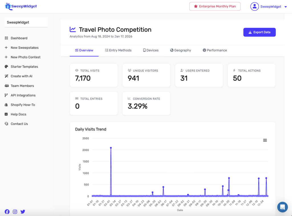 Track the performance of your sweepstakes and giveaways with comprehensive analytics. SweepWidget’s analytics dashboard provides detailed insights into visitor behavior, traffic sources, device usage, geographic distribution, and conversion metrics. Use this data to optimize your campaigns and understand what drives the most entries.
