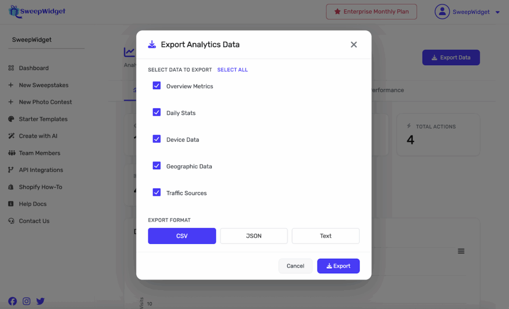 At the top of the analytics page, you’ll see the giveaway title and the date range being analyzed. Click the Export Data button in the top-right corner to download your analytics in CSV, JSON, or text format.
