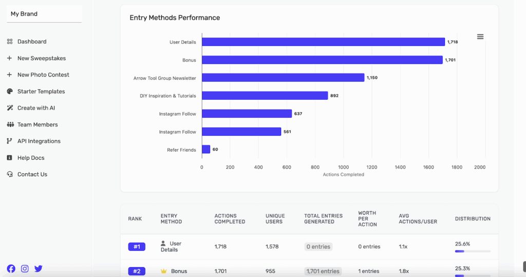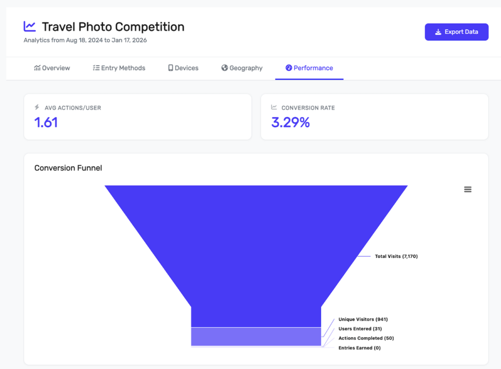Tip: Higher averages for actions and entries per user indicate strong engagement. If these numbers are low, consider offering bonus entries for completing multiple actions or making entry methods more compelling.