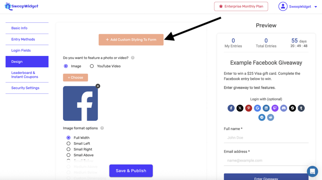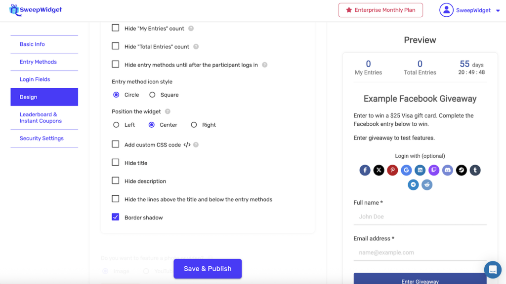 Control where your giveaway widget appears on the page by positioning it to the left, center, or right. This setting affects both hosted landing pages and embedded widgets on your own website.