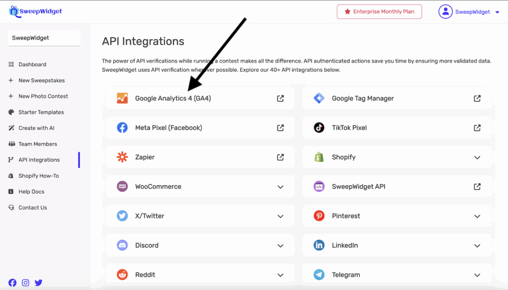 In your SweepWidget dashboard, go to API Integrations from the left sidebar menu.