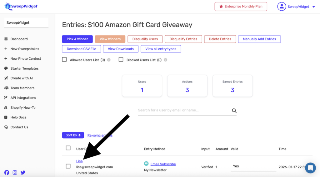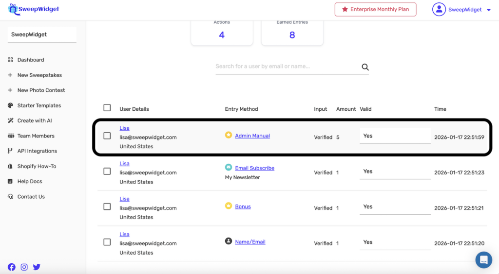 - Affects winner selection – Manually added entries increase the user’s chances of being selected as a winner
