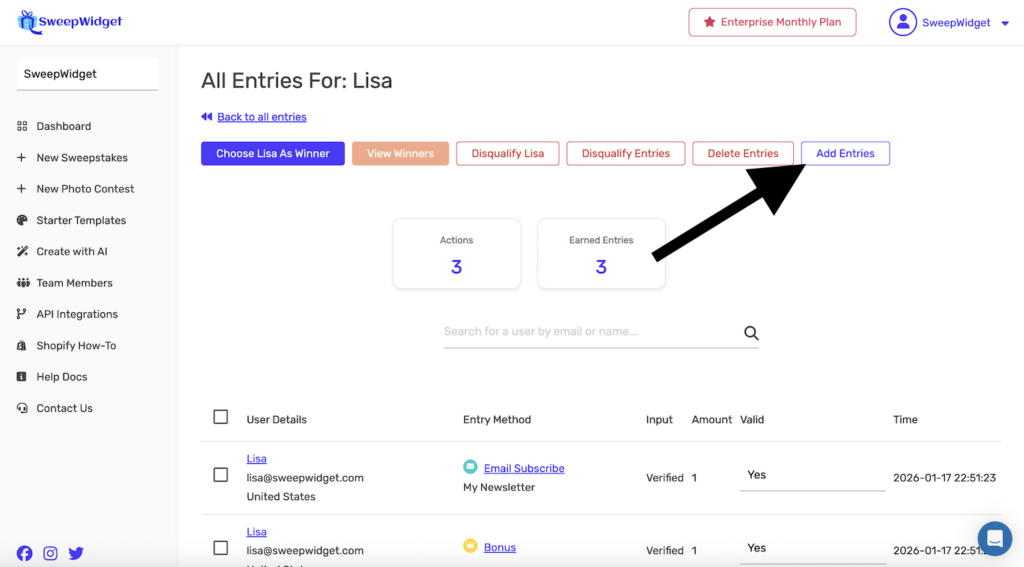SweepWidget allows you to manually add bonus entries for any user who has already entered your giveaway. This is useful for rewarding participants, compensating for technical issues, or adding entries earned through offline activities.