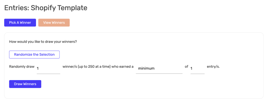 The form reads: “Randomly draw [X] winner/s (up to 250 at a time) who earned a [minimum/maximum] of [X] entry/s.”