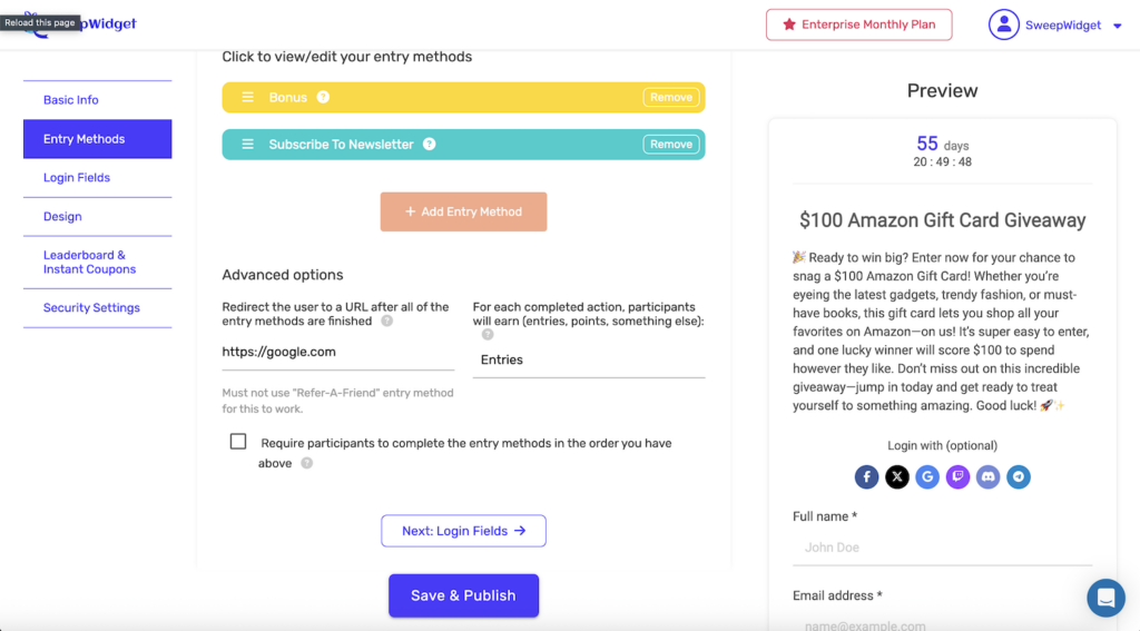 Automatically redirect participants to any URL after they complete all entry methods in your giveaway. This feature is perfect for guiding users to your website, a thank you page, a product page, or any other destination after they’ve finished entering.