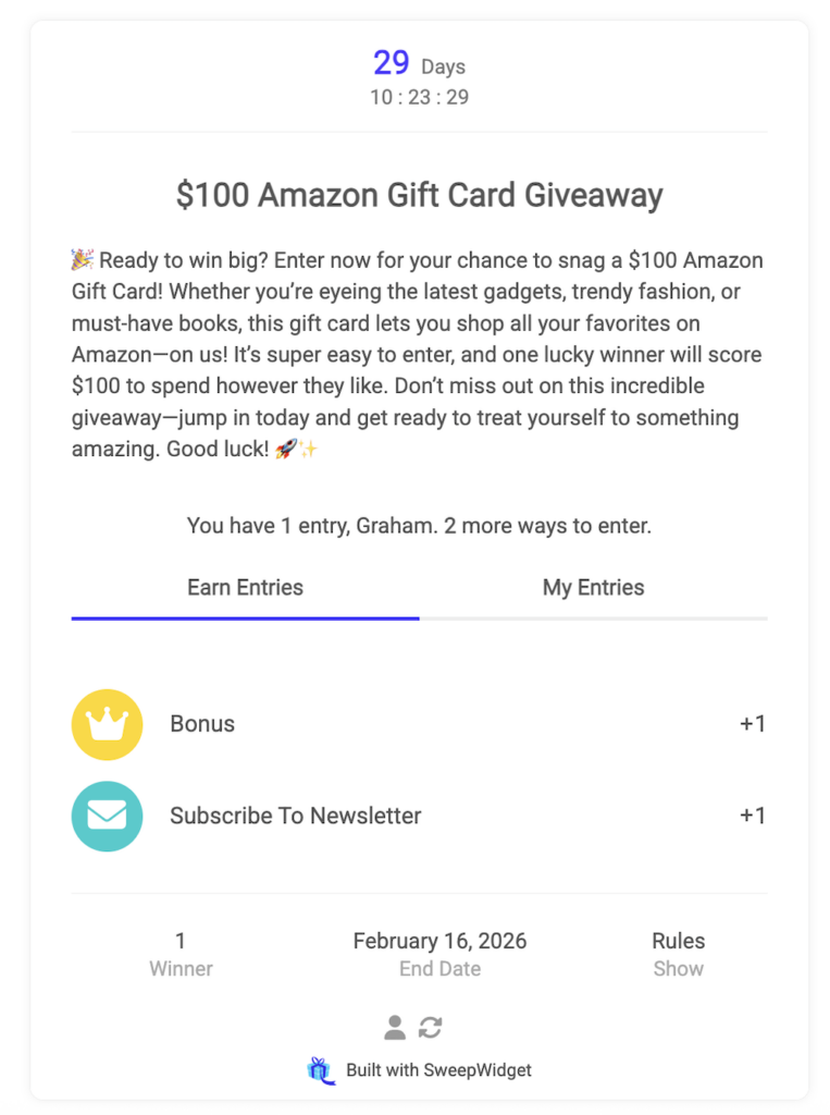 Participants see the normal giveaway widget with available entry methods to complete.