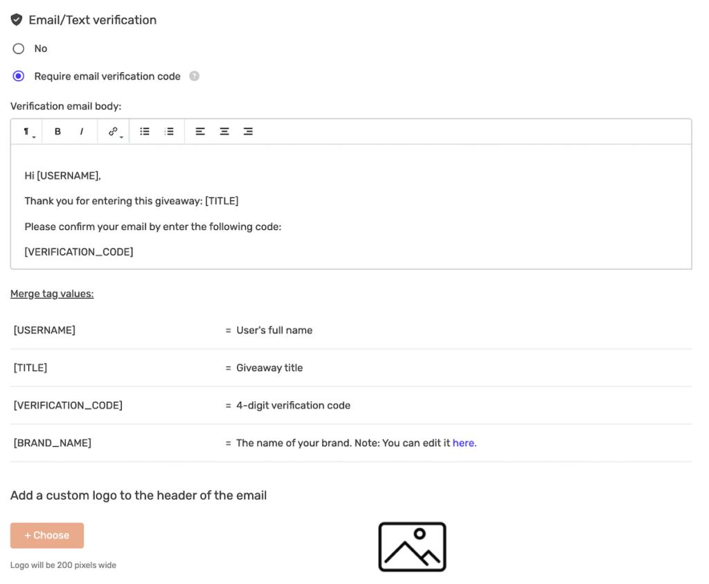 Email verification helps ensure that participants use valid email addresses when entering your giveaway. When enabled, users must enter a 4-digit code sent to their email before their entry is confirmed.
