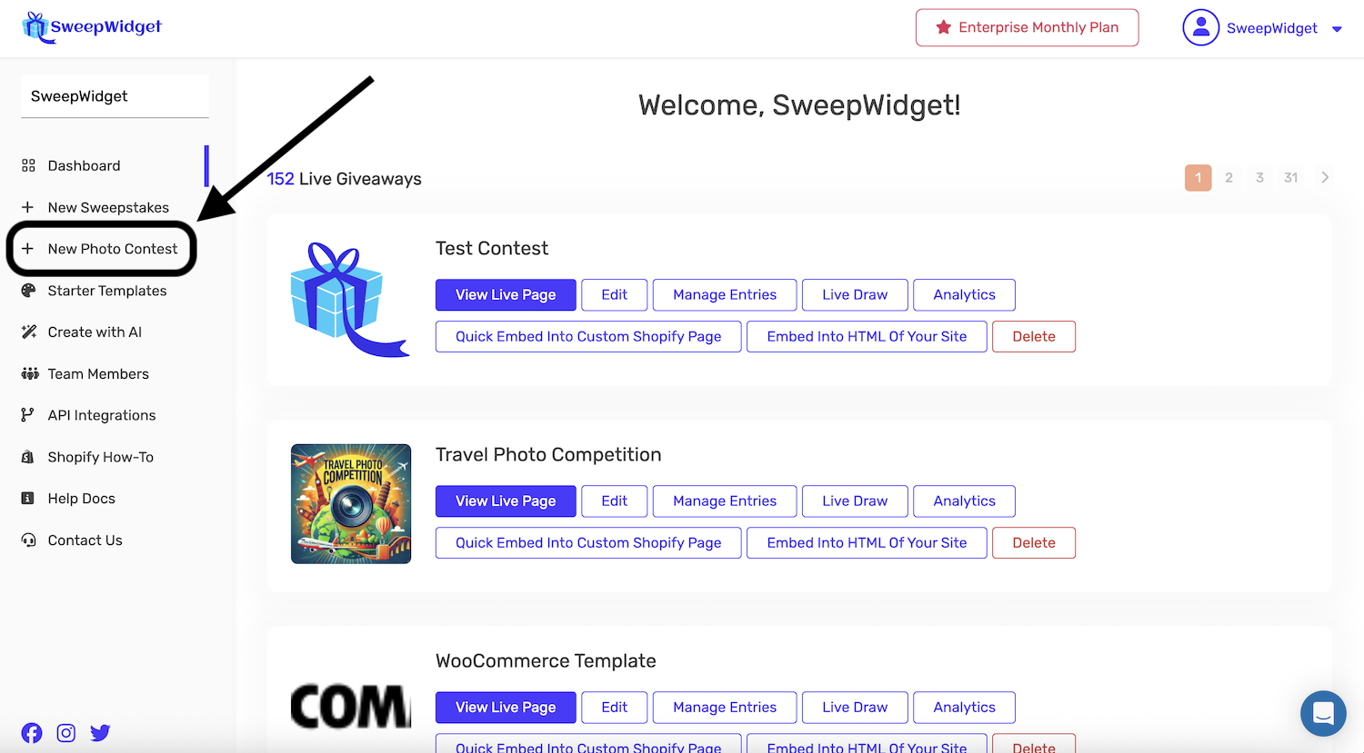 First, you’ll need to click on the New Photo Contest link in the left nav bar of your SweepWidget account.