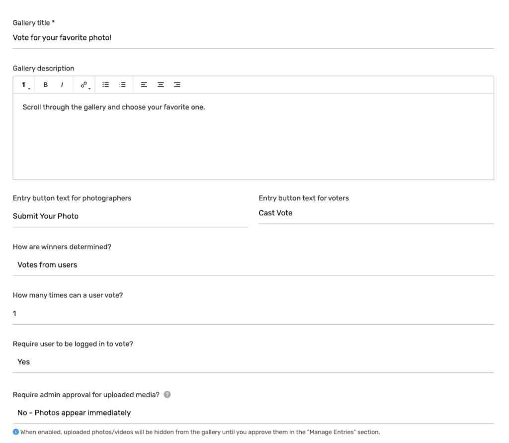 • Gallery title – The heading displayed above your photo gallery (e.g., “Vote for your favorite photo!”)