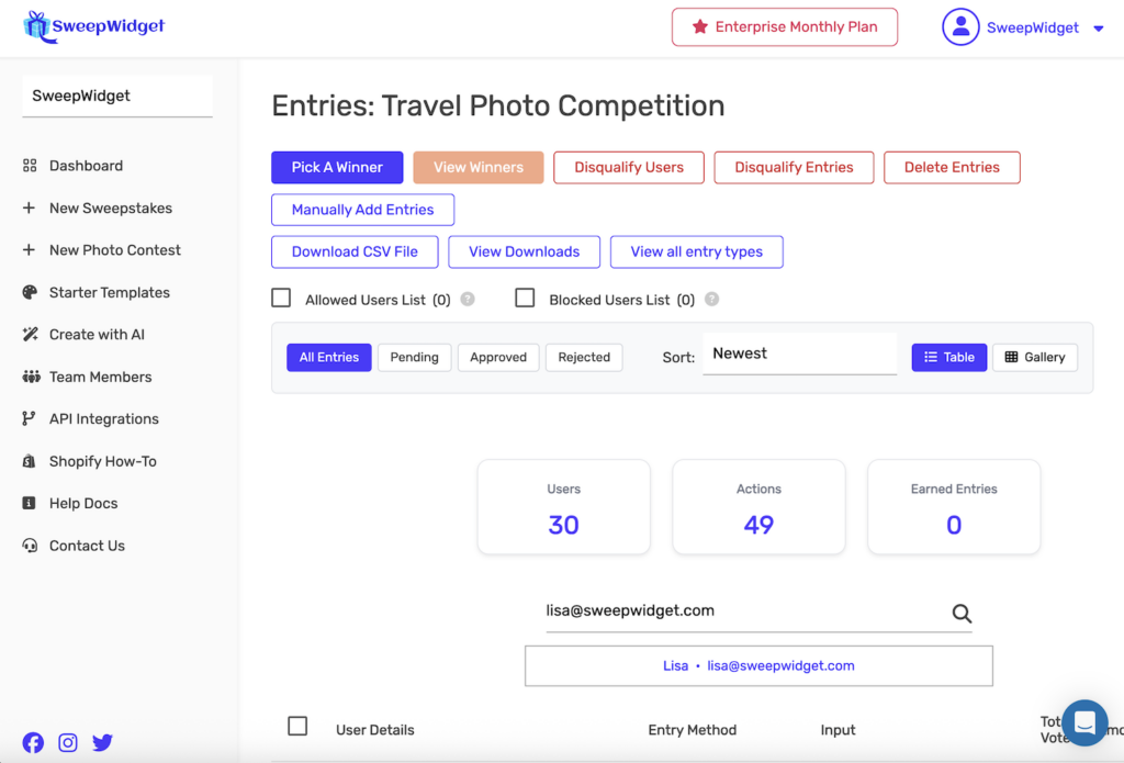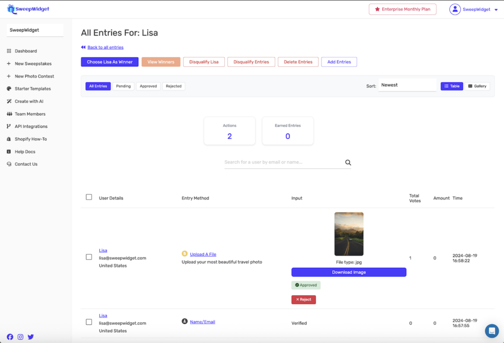 The Entries page is your central hub for managing all participants in your giveaway. View entry details, search for specific users, filter by status, approve or reject submissions, and take action on individual entries or users.