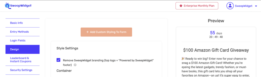 - Add your own logo – Replace SweepWidget branding with your custom logo