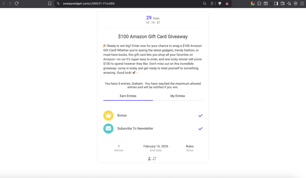 - Your giveaway URL will still be on the sweepwidget.com domain (for hosted pages)